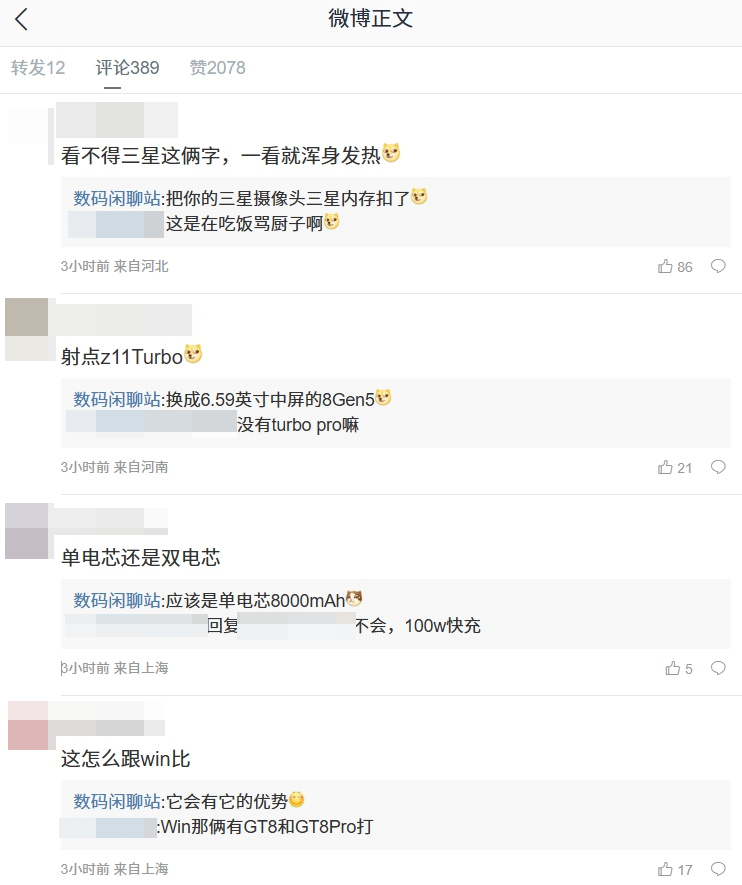 另外,在評論區,與網友互動時,針對網友提出的新機采用單電芯還是雙電芯設計,該博主回應稱,“應該是單電芯8000mAh。”針對新機能否和榮耀WIN系列做對比,該博主回應稱,“它會有它的優勢。”另外,博主還透露了iQOO Z11 Turbo新機的信息,據其稱,“換成6.59 英寸中屏的8 Gen5。”