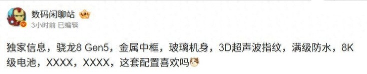 日前,數碼博主“數碼閑聊站”再次曝光了一款搭載驍龍8 Gen5處理器的新機,該機采用金屬中框+玻璃材質機身,支持3D超聲波指紋和滿級防水,內置8000mAh左右電池等。另外還有兩個亮點,該博主暫時沒有透露。而根據評論區網友的推測來看,這款機型很可能來自真我Neo8新機。
