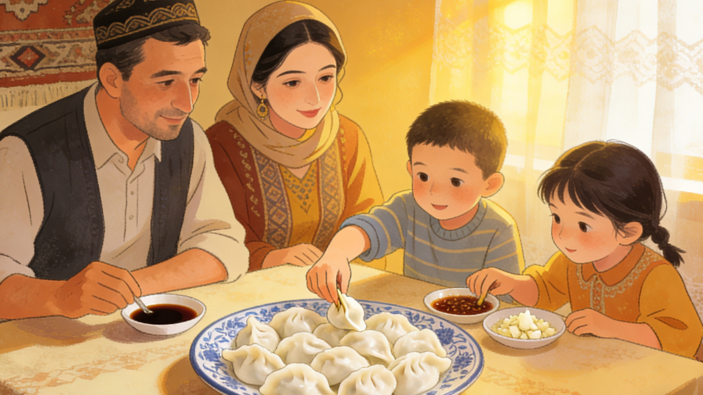 周四傍晚,暮色像化不開的墨,暈染了烏魯木齊的街巷。窗外的路燈次第亮起,暖黃的光透過窗紗,灑在餐桌的青花瓷盤上。我們一家人圍坐在一起,白胖的餃子在盤子里碼得整整齊齊,韭菜豬肉餡的香氣混著香醋和蒜泥的味道,絲絲縷縷鉆進(jìn)鼻腔。兒子伸手去夾餃子,女兒踮著腳尖夠醋碟,老伴笑著拍了拍他倆的手背,滿屋子都是熱熱鬧鬧的煙火氣。