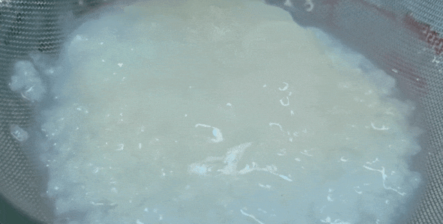 大碗上放細網漏勺,趁熱倒米漿,用勺背壓米渣擠盡米漿。涼了米漿變稠難過濾,米渣可做米餅或丟棄,只留細膩米漿。