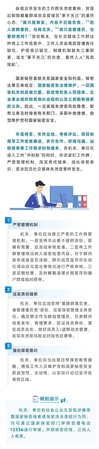 年尾將至,各機關、單位在進入工作“沖刺期”的同時,亦須緊盯工作群,嚴密管理機制,壓實責任鏈條,強化保密意識,堅決防范社交媒體失泄密事件發生。