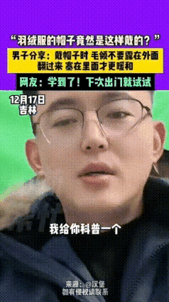 不過說回來帶毛領(lǐng)也是時(shí)尚和漂亮的,只是看你會(huì)不會(huì)來妝扮。他是具有多變性的,這不一東北小伙發(fā)現(xiàn)把帽子上的毛毛領(lǐng)裝回帽子里,在戴好記好也是非常暖和的,不用在單獨(dú)戴帽子和別的圍膊呢!