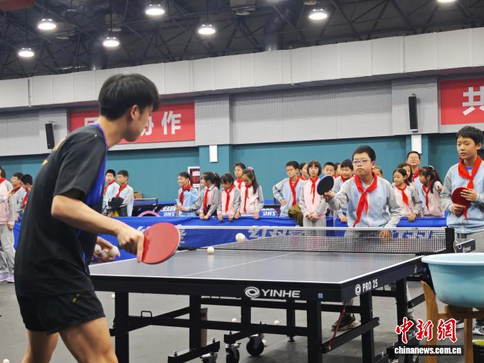 圖為運動員與學(xué)生們進行趣味對打。孔令佑 攝