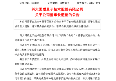 國盾量子公告,公司董事長呂品先生不幸逝世。呂品先生于2025年5月起擔(dān)任公司董事長,并擔(dān)任戰(zhàn)略與投資委員會主任委員、薪酬與考核委員會委員。