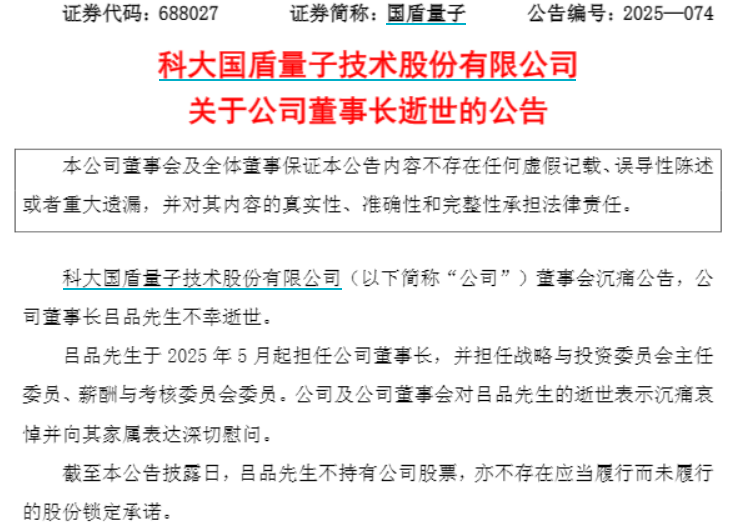 【大河財立方消息】12月18日晚間,科大國盾量子技術股份有限公司(證券簡稱:國盾量子)發布公告稱,公司董事會沉痛公告,董事長呂品不幸逝世。