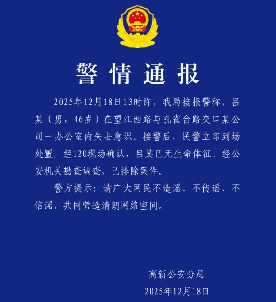 當晚,合肥市高新公安分局發布的警情通報顯示,2025年12月18日13時許,該局接報警稱,呂某(男,46歲)在望江西路與孔雀臺路交口某公司一辦公室內失去意識。接警后,民警立即到場處置。經120現場確認,呂某已無生命體征。經公安機關勘查調查,已排除案件。