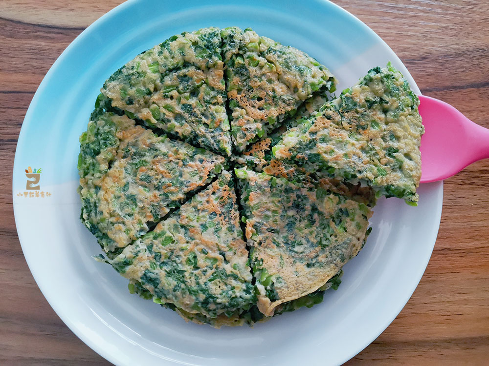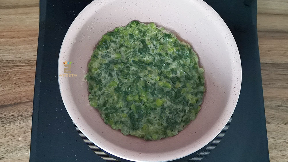 3、鍋子熱透后,噴一點油在鍋底,茼蒿倒里邊,鏟子將其攤薄,烙到凝固成型即可盛出。