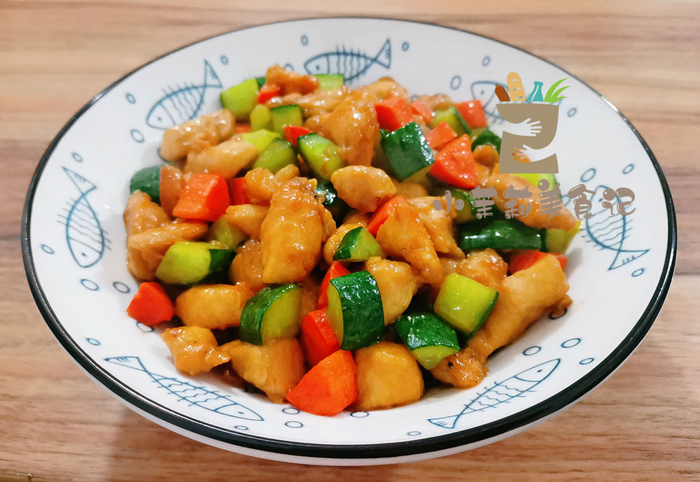 2、另外切點黃瓜,胡蘿卜作為配菜。屆時雞肉挑出來,撒上淀粉,通過攪拌在表面裹勻。