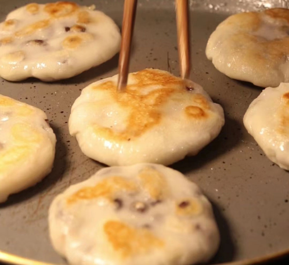 4、淋一點油到面團里,揉圓,這樣不粘手。接著切成小劑子,分別在手里捏出小窩,放點紅豆包起來壓扁即可。在不粘鍋里,用中等火去烙,每隔兩三分鐘翻一次,直到金黃上色后出鍋。