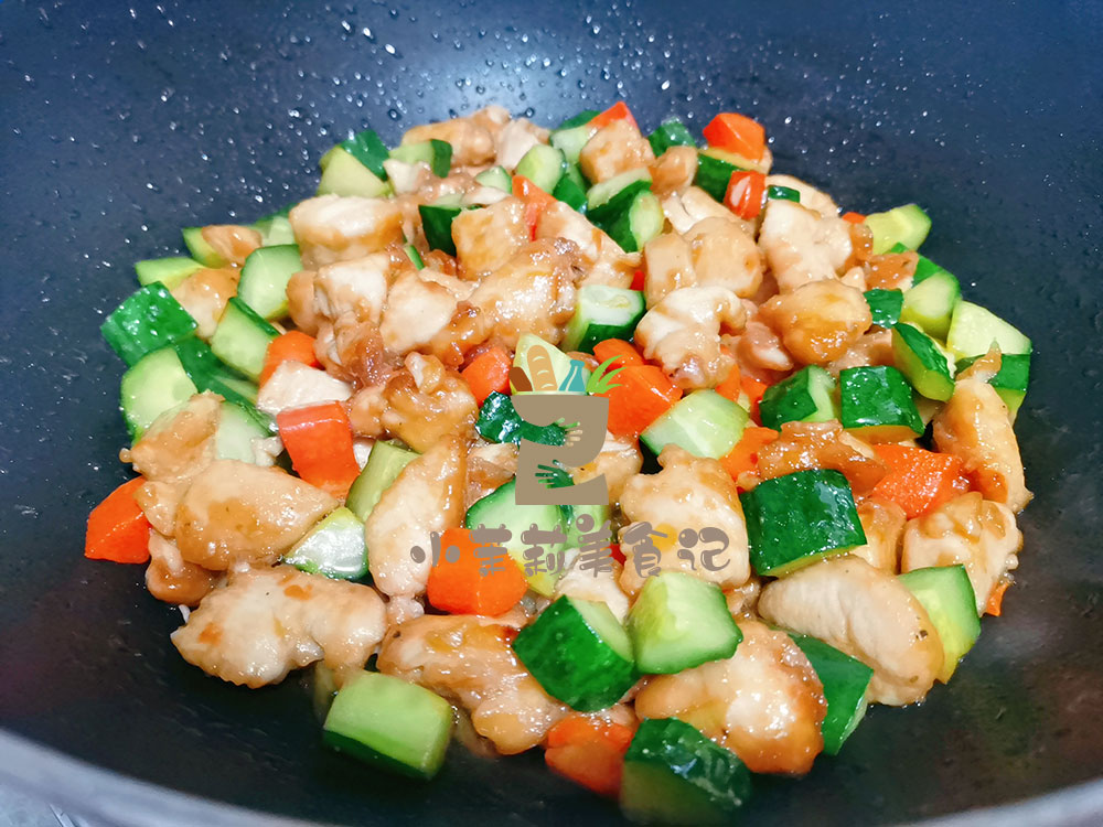 3、起鍋放油均勻熱透,雞肉倒進去,幾秒之后鏟子扒拉散,繼續炒到變色。蔬菜倒進去,繼續炒炒,補充點鹽,些許糖和醋,調好味道出鍋。