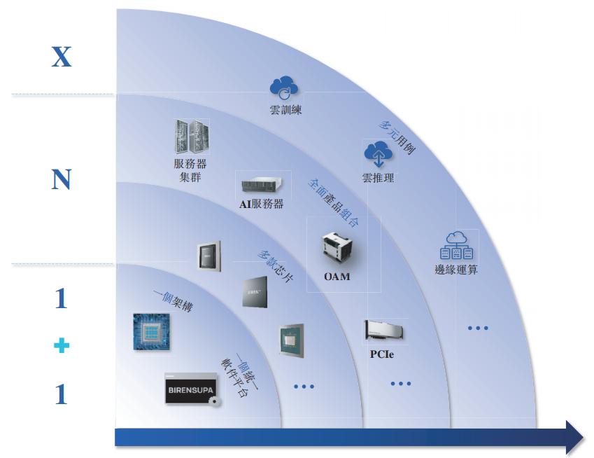 目前壁仞科技實施“1+1+N+X”平臺戰略。可概括為1個GPU架構+1個統一軟件平臺,衍生出多款芯片及全面產品組合,以賦能廣泛的應用場景。