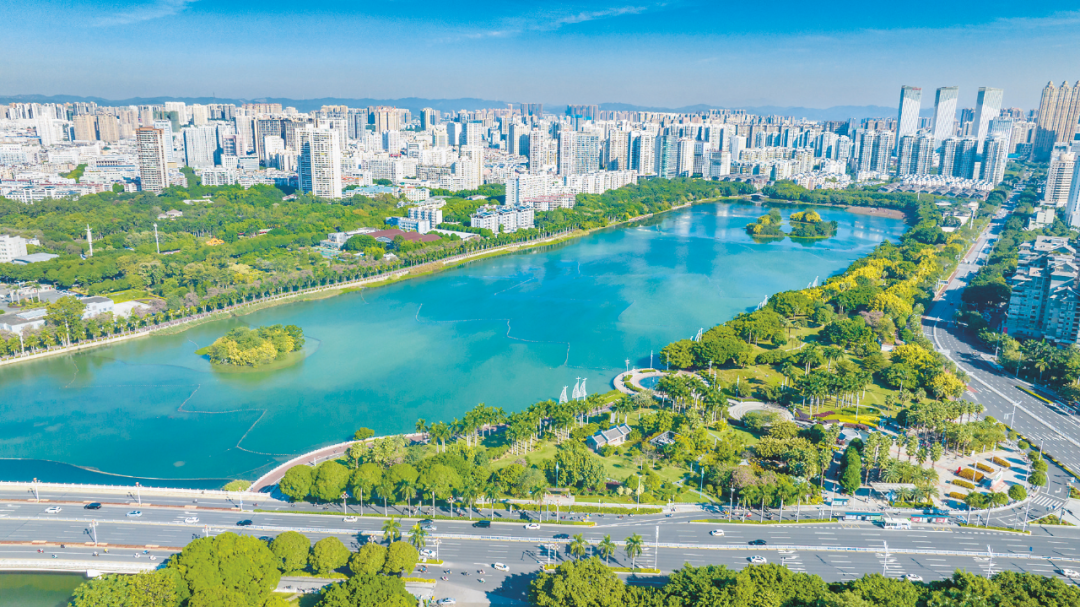 南寧市持續加強生態文明建設,不斷擦亮“中國綠城”金字招牌。圖為“南寧藍”映襯下的南湖公園美景如畫。記者 黃維業 攝