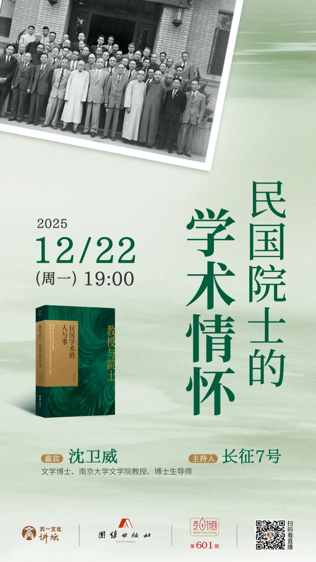 12月22日19:00 文學博士、南京大學文學院教授、博士生導師沈衛威做客天一文化講壇分享民國院士的學術情懷,歡迎預約、關注、轉發活動。