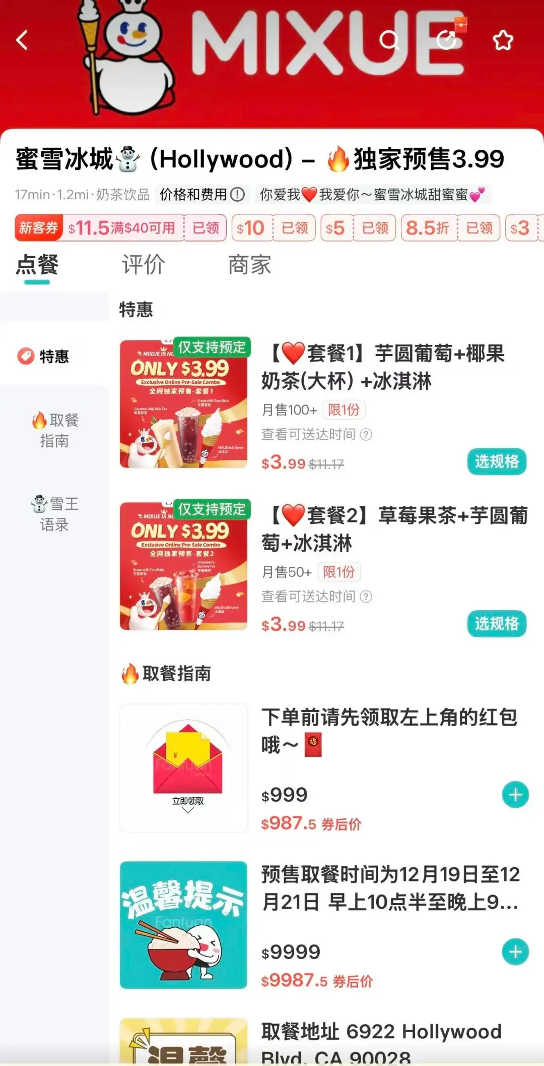 雖然尚未正式營業(yè),但這家位于好萊塢的“蜜雪冰城”已開啟獨家預(yù)售,上架了2款預(yù)售套餐——這兩款套餐定價均為3.99美元(約合人民幣28元),含兩杯飲品及冰淇淋,支持微信、支付寶支付,新用戶最低僅需1.17美元(約8.2元人民幣)。