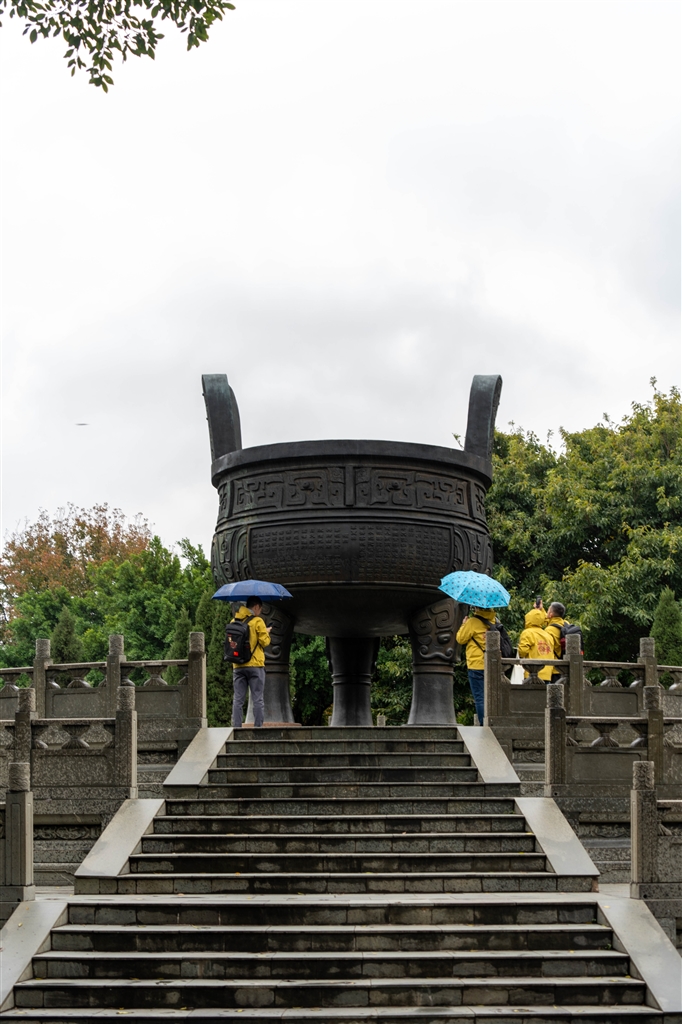 距離江西客家博物院不遠處的龜角尾公園里,客家先民南遷紀念壇、紀念鼎臨贛江而立。