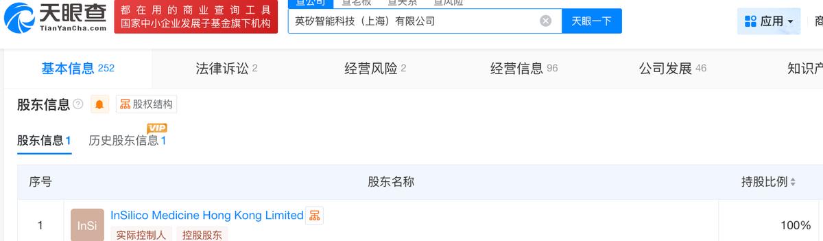 天眼查App信息顯示,英矽智能在境內的主要實體為“英矽智能科技(上海)有限公司”,成立于2019年6月。目前,該公司的注冊資本為5600萬美元,法定代表人為Aleksandrs Zavoronkovs,全資股東為InSilico Medicine Hong Kong Limited。