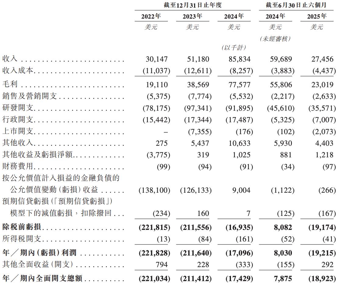 業績方面,2022年、2023年、2024年度和2025年上半年,英矽智能的營收分別約為3014.7萬美元、5118.0萬美元、8583.4萬美元和2745.6萬美元,凈虧損分別為2.22億美元、2.12億美元、1709.6萬美元和1921.5萬美元。