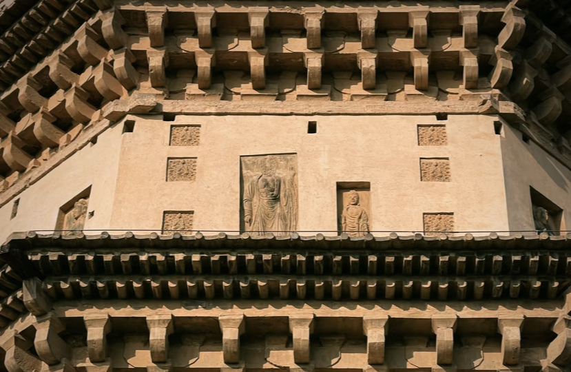 #五花寺塔為磚石混砌結(jié)構(gòu)的密檐式塔,其平面為八角,塔身九級。塔基用條石鋪砌,塔體上部用磚砌,一、二層設(shè)有仿木斗拱,三層以上由疊澀磚檐組成。塔的每層斜角處向外伸出一根木頭,原來掛有鈴鐺,后來木頭鈴鐺都?xì)У袅?。塔?nèi)有塔心室,室內(nèi)原有通道通至塔頂。塔的一、二、三、四、六層,正南均設(shè)有塔門。二層正南面的塔門為真門,其余各門均為裝飾的假門,門兩側(cè)裝飾有磚刻浮雕的力士或菩薩像,其面部莊嚴(yán)威武,衣飾線條流暢,部分已毀。