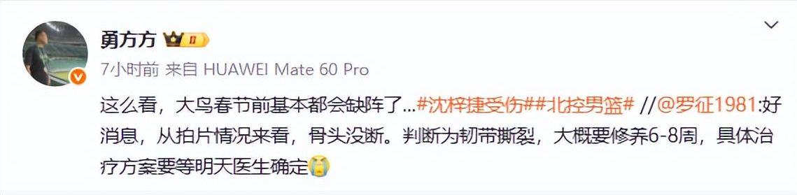 沈梓捷的傷情也令北控球迷非常擔心,韌帶有沒有斷裂?這都是球迷牽掛的事,而且深夜沈梓捷的傷情報告出來了。據北京媒體勇方方報道,”從拍片情況來看,骨頭沒斷。判斷為韌帶撕裂,大概要休養6-8周,具體治療方案要等明天醫生確定。”這么看,大鳥春節前基本都會缺陣了。不過骨頭沒斷,是不幸中的萬幸。看來休息兩個月后,又可以重回賽場了。