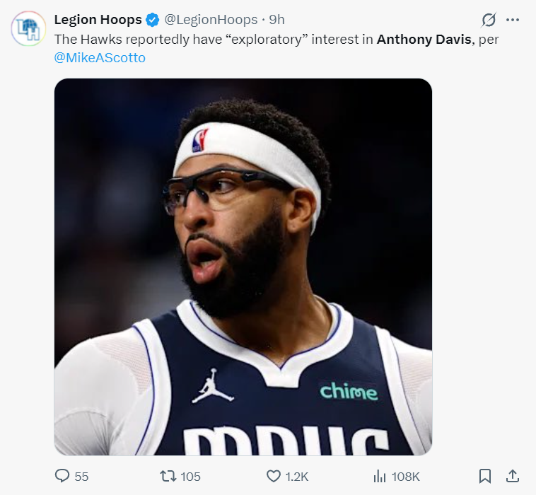 根據(jù)Hoops記者麥科-斯科特的消息,亞特蘭大老鷹隊已經(jīng)開始對安東尼-戴維斯進行試探性的報價。濃眉本賽季雖然有所發(fā)福但還是保持了一個不錯的競技狀態(tài),老鷹目前東部第七有希望沖擊前六的席位,他們想繼續(xù)提升陣容。