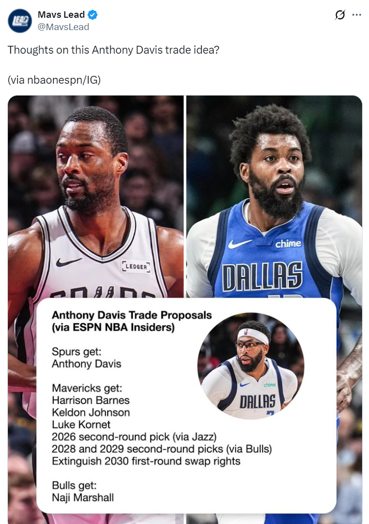 不過獨行俠媒體認為馬刺是有希望攪局的,因為戴維斯肯定更愿意留在西部,而且他也更愿意去馬刺這樣未來有奪冠前景的球隊,模擬了這筆三方交易:
