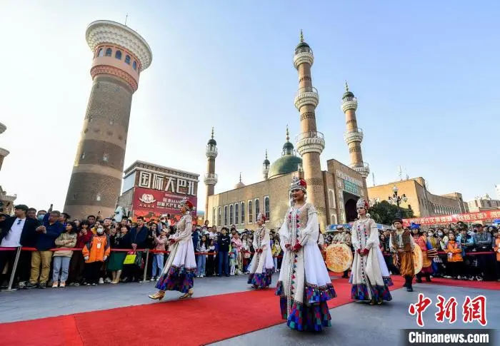 位于新疆烏魯木齊市二道橋的新疆國際大巴扎舉行開街儀式,吸引眾多市民及游客圍觀。中新社記者 劉新 攝