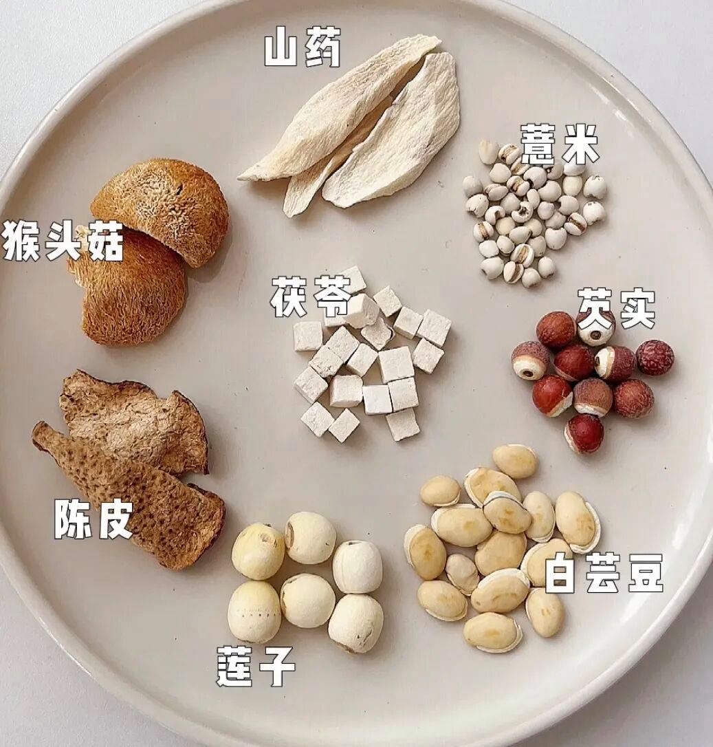 猴頭菇、陳皮、白扁豆、蓮子、山藥、薏米仁、芡實、陳皮