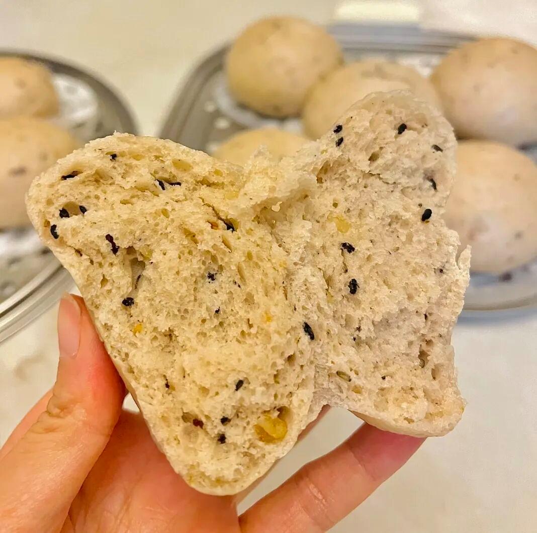 八珍粉別加太多,占面粉 1/10 即可,免影響口感;發酵時溫度別太高,免饅頭發酸;涼透后密封保存,吃的時候加熱就行。