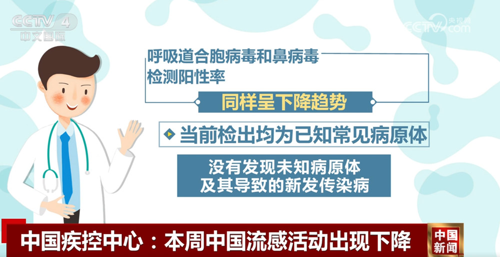 央視網消息:中國疾控中心18日晚發布全國急性呼吸道傳染病哨點監測情況。監測結果顯示,本周中國流感活動出現下降,總體仍處于高流行水平,其中東北、華北、西北地區省份流感活動持續下降,華中、華東、華南、西南地區仍有部分省份流感活動上升,但上升幅度趨緩;呼吸道合胞病毒和鼻病毒檢測陽性率同樣呈下降趨勢。當前檢出均為已知常見病原體,沒有發現未知病原體及其導致的新發傳染病。