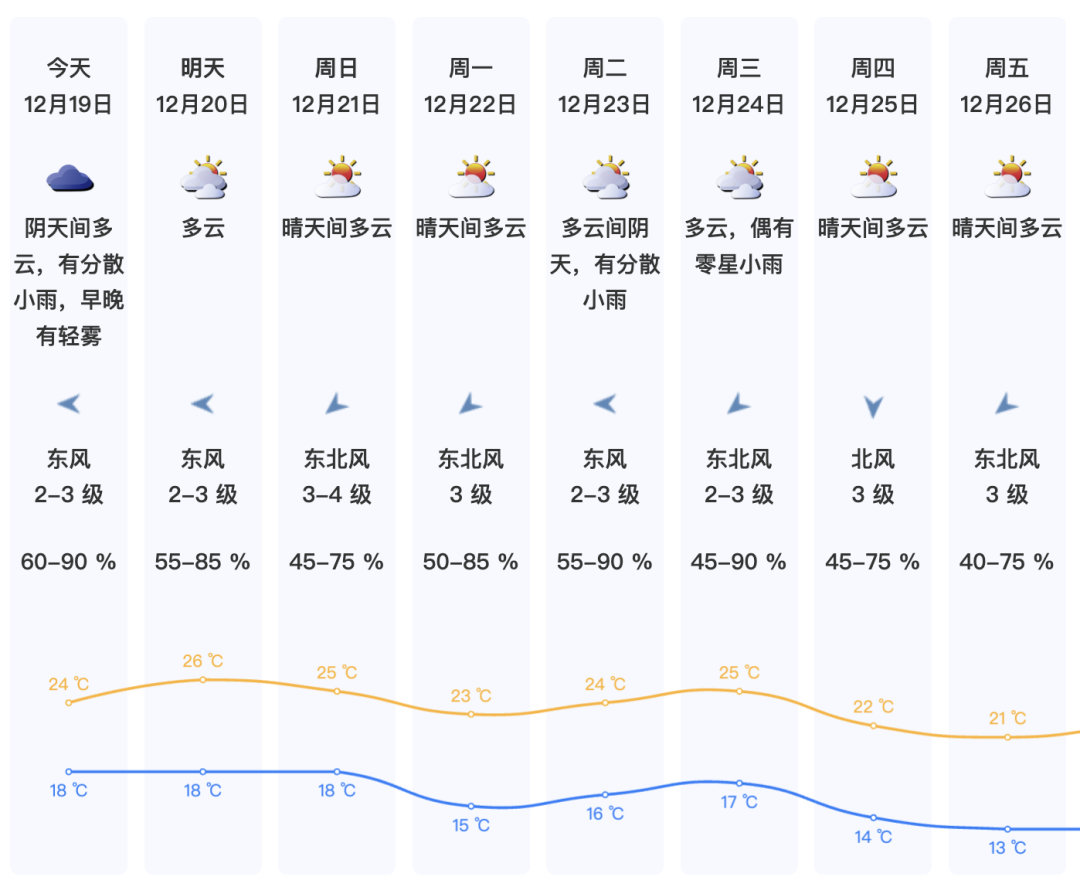 深圳氣象臺預報,我市今天陰天間多云,有分散小雨;氣溫18℃-24℃;東風2-3級;相對濕度60%-90%。
