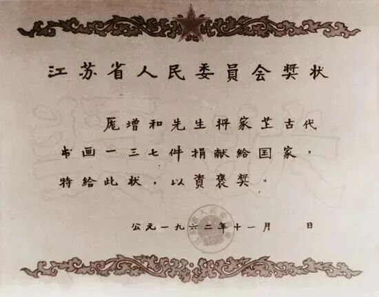 捐贈(zèng)古代書畫137件的獎(jiǎng)狀
