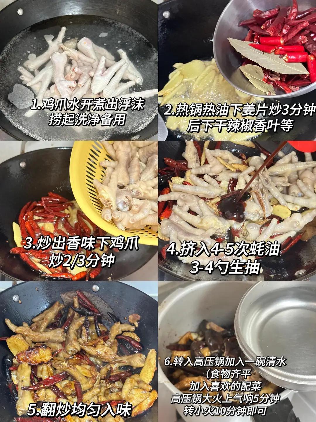 備料:雞腳一斤(讓攤主幫忙剪掉指甲)、姜四五片、干辣椒一小把(按自己吃辣的程度來)、八角兩顆、冰糖五六粒、生抽三勺、老抽一勺、料酒兩勺、鹽適量。