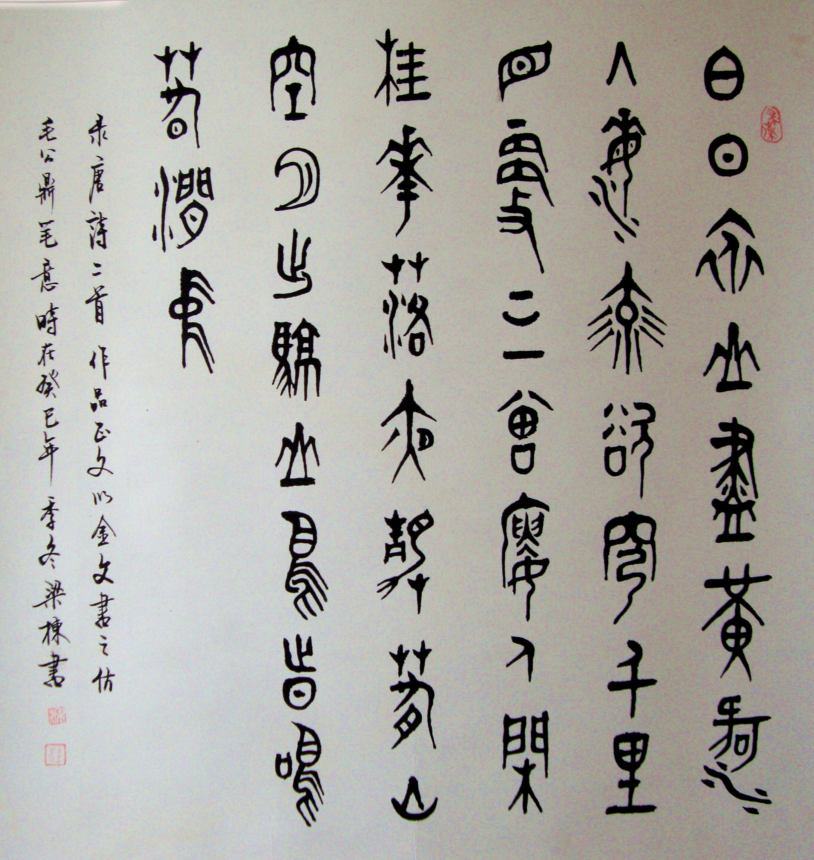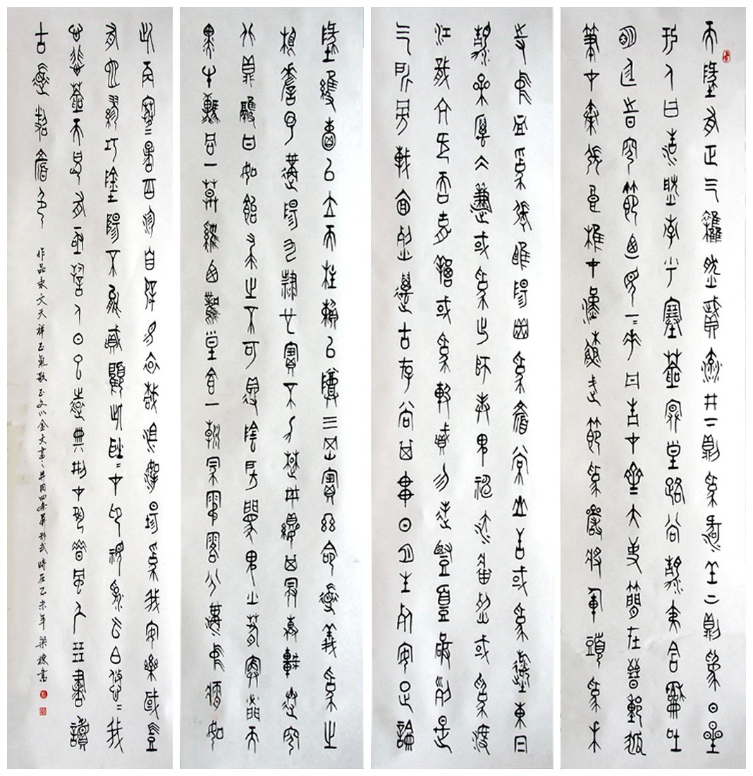 書法研習是藝術生活重要組成,從唐楷到魏碑、行書到篆書,始終溯源傳統、潛心鉆研,筆墨間感受漢字魅力。學習脈絡清晰,高中以唐楷為基,系統學習柳公權《玄秘塔碑》《神策軍碑》,練就工整勻稱的楷書功底;大學轉向顏真卿書法,研習《顏勤禮碑》《東方朔畫贊》,豐富筆墨技法、提升素養。工作后拓寬視野,深耕魏碑、行書與篆書,研習《龍門二十品》《張猛龍碑》,魏碑雄渾讓書法添力道;堅持行書《懷仁集王羲之書圣教序》臨摹,作品漸趨流暢有韻味。尤為癡迷商周金文,搜集《毛公鼎》《大盂鼎》等銘文逐字研習,以集字創作系列作品突破自我。扎實研習終獲成果,2000 年登封市迎千年教工書畫展,金文八米長卷《正氣歌》獲特等獎,成為當時最年輕的最高獎獲得者;2006 年鄭州市教工書畫展,金文作品《浪淘沙?北戴河》獲一等獎,獎項是對其書法水平的認可,更是堅持的回饋。?