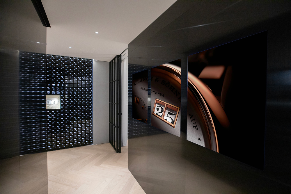 一層空間始于櫥窗內展示的一座以ZEITWERK時間機械腕表的機芯數字盤元素打造的裝置,隨之來到朗格六大腕表系列陳列區,包括LANGE 1朗格1系列、SAXONIA薩克森系列、1815系列、RICHARD LANGE理查朗格系列、ZEITWERK時間機械系列、ODYSSEUS奧德修斯系列。與之相鄰,特別陳列1815腕表及古董懷表,與一面數字化顯示的歷史墻。歷史墻另一側展示的是朗格極具創新的ZEITWERK時間機械腕表及其由451個零件組成的機芯墻。在一層,賓客可品鑒當季推出的新款腕表、旗艦店特別款腕表,以及其他精選腕表,亦可至特別打造的貴賓尊享區,試戴體驗精密時計作品。