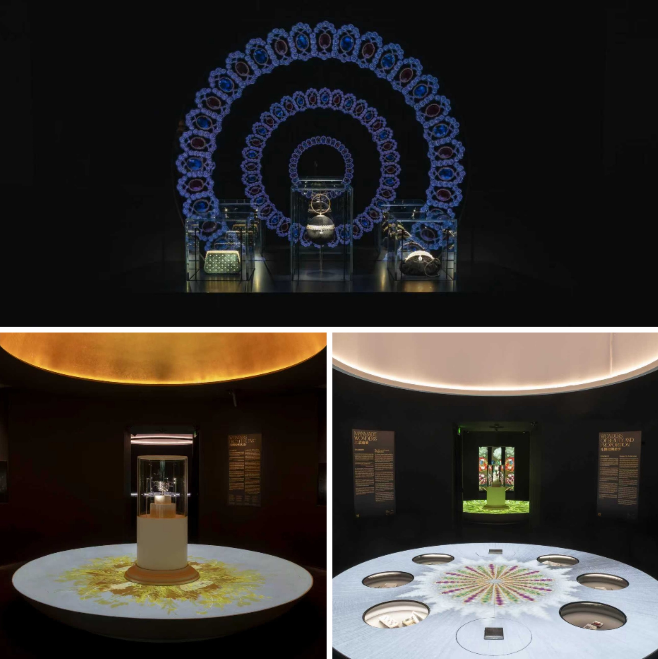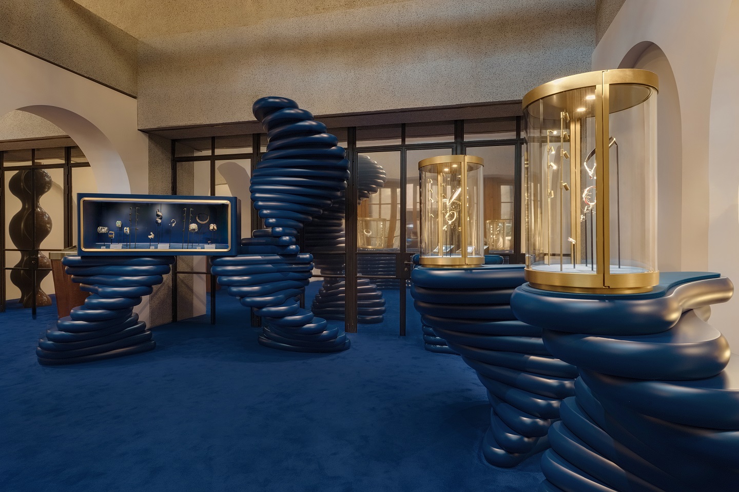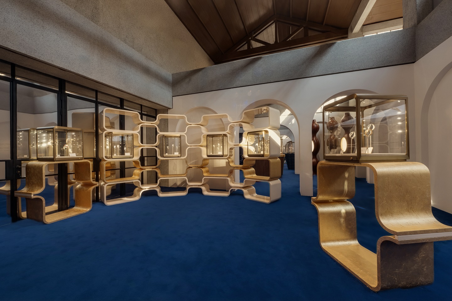Piaget Society主題展區空間內布置有藍色的旋轉裝置,其設計靈感源自法國的塞特小鎮(Sète)層級而上的自然風光, 同時也是向20世紀80年代克勞德·蒙塔納(Claude Montana)推出的經典香水的瓶身造型致敬。此展區的高級珠寶作品充斥著濃郁的色彩,珍貴的寶石與獨特的造型,將Piaget Society的歡欣愉悅氛圍打造得淋漓盡致。來賓更能鑒賞難得一見的Patrimony私人典藏系列作品。