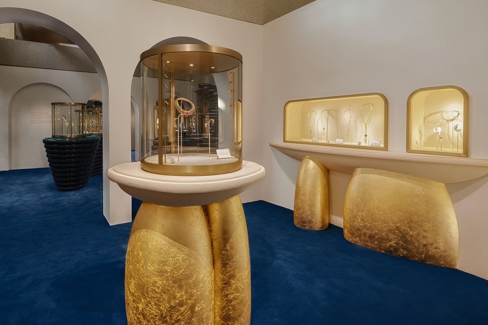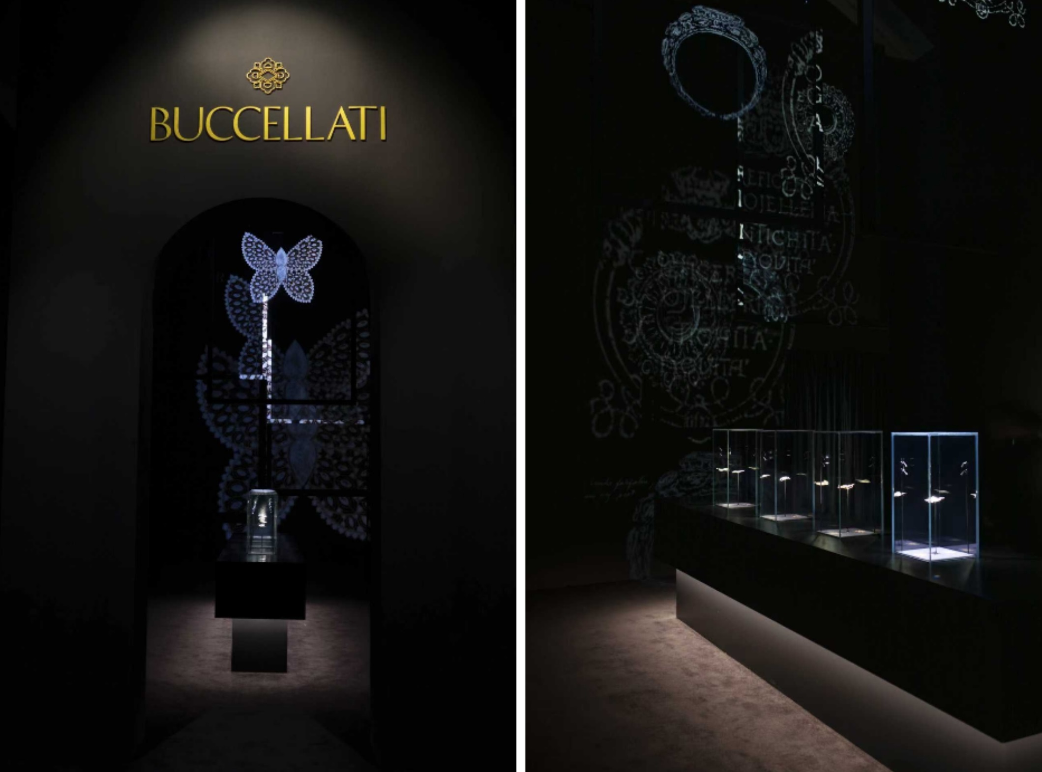 作為整場展覽的終章,“典藏長廊”展廳四根中央立柱分別呈現品牌四大獨特工藝的精髓:蕾絲鏤空、“Honeycomb”蜂巢工藝、手工雕刻(包括“Rigato”“Telato”“Segrinato”“Ornato”以及“Modellato”五大獨創技法)、連環成鏈。兩側立柱則匯集品牌創立至今最具標志性的作品系列,彰顯布契拉提美學風格的延續與演進。