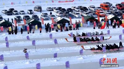 12月14日,黑龍江省伊春市2025—2026年冬季冰雪旅游系列活動(金林站)暨金林區第五屆森林冰雪歡樂季舉行。在峰巖山寨景區活動現場,冰上龍舟競賽成為焦點,在零下二十多攝氏度的嚴寒中,一支支龍舟隊伍整齊劃一地沖向終點,圍觀游客紛紛拿起手機記錄,在冰天雪地間感受北國“速度與激情”。