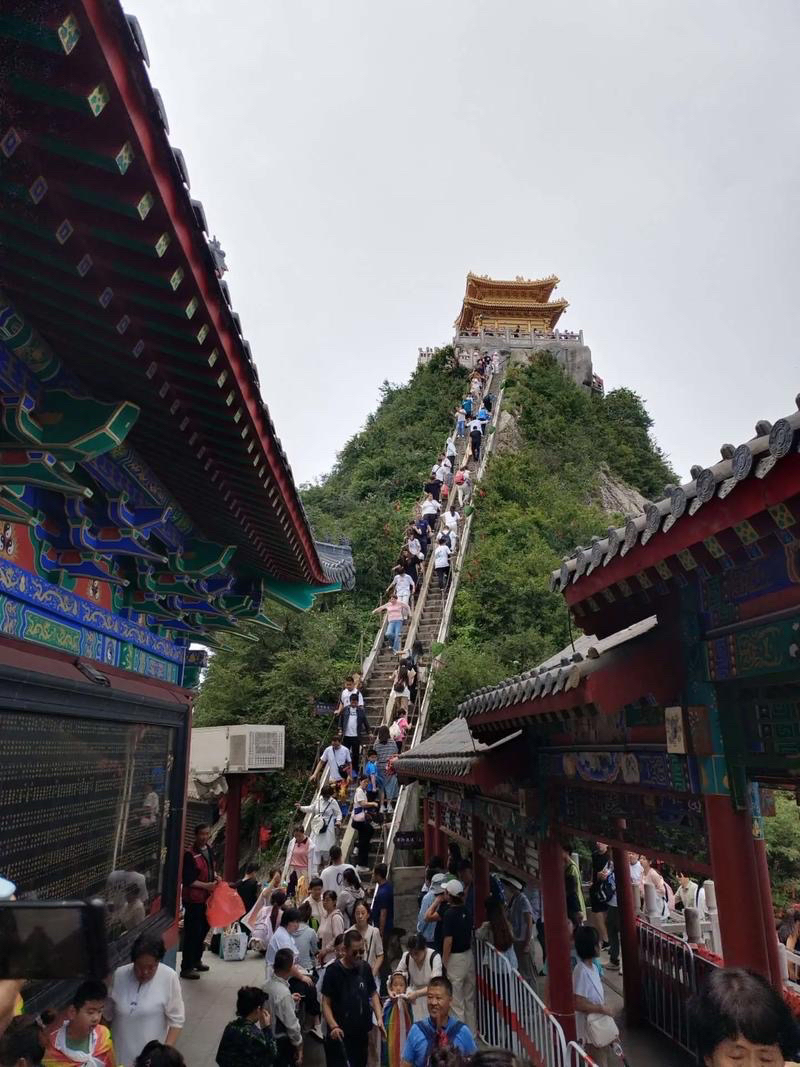 乘坐時(shí),轎廂平穩(wěn)攀升,兩側(cè)景致次第鋪展:一級(jí)索道穿林而過(guò),滿目蒼翠中可見峭壁褶皺與迎客松;二級(jí)索道視野更闊,伏牛山群峰如濤,云霧漫過(guò)時(shí)恍若踏云而行。行至高處,金頂?shù)烙^群輪廓漸顯,崖壁石刻隱約可辨,十里畫屏的石林奇觀近在咫尺。