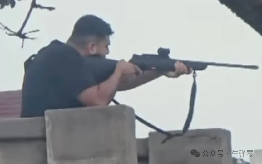 黑衣槍手正在開槍掃射,這名白衣男子,突然沖到他背后,一把抓住他的槍支,和他扭打在一起,然后將槍支奪到手中。