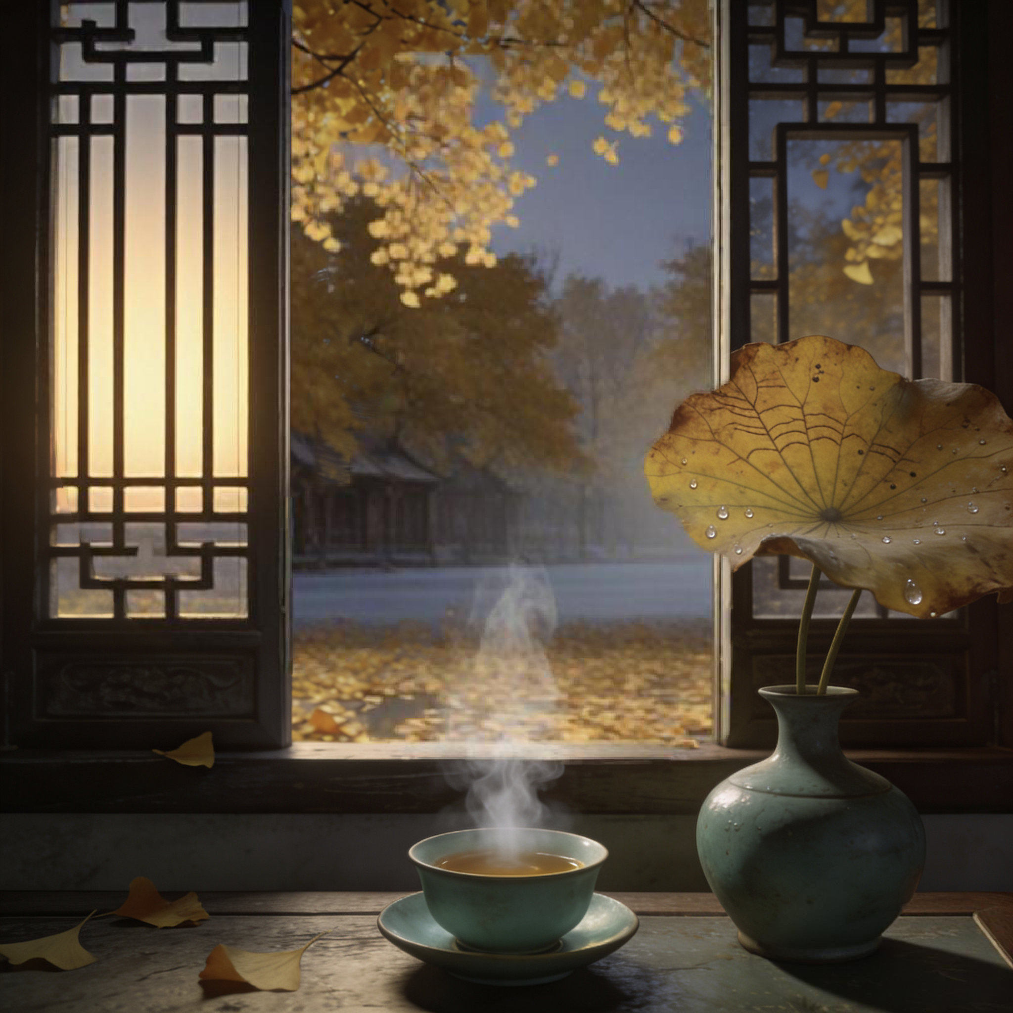 本詞以秋景為引,融古典意象與人生哲思于一爐,情景相生間見真味,堪稱借景抒情的佳作。上闋鋪陳清寂秋景:銀杏鋪街如碎金,晚風(fēng)攜香,殘荷滴露映疏窗,鏡頭由遠(yuǎn)及近,漸次聚焦于“黛玉眉邊月”這一妙筆——將新月比作黛玉眉黛,既暗合《紅樓夢》古典意蘊(yùn),又以“照見鬢邊霜”勾連時(shí)光感慨,景中含情,情藏歲月痕,情景交融無縫。