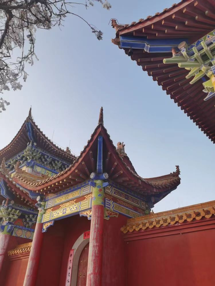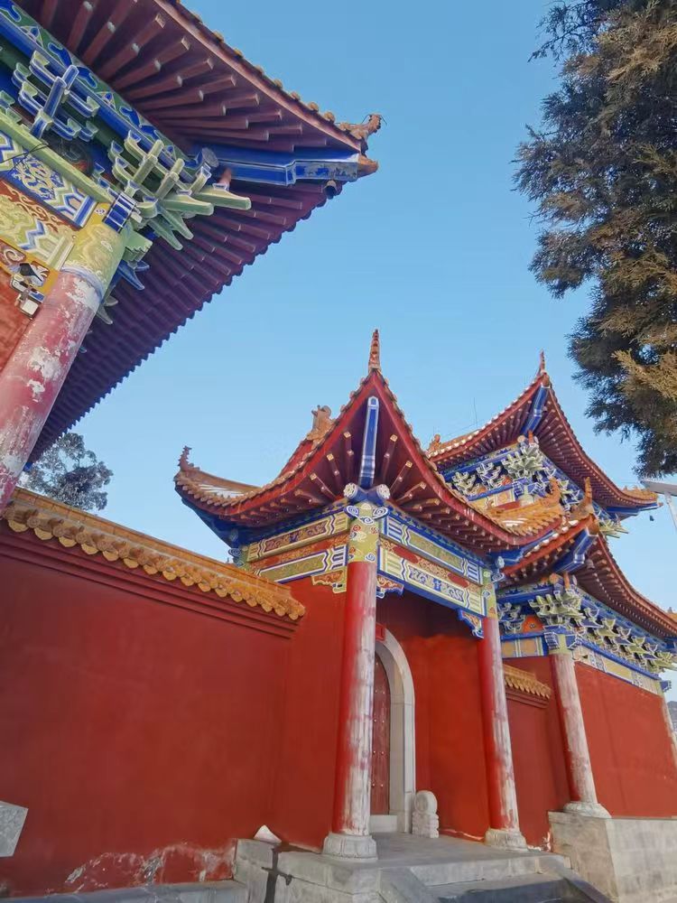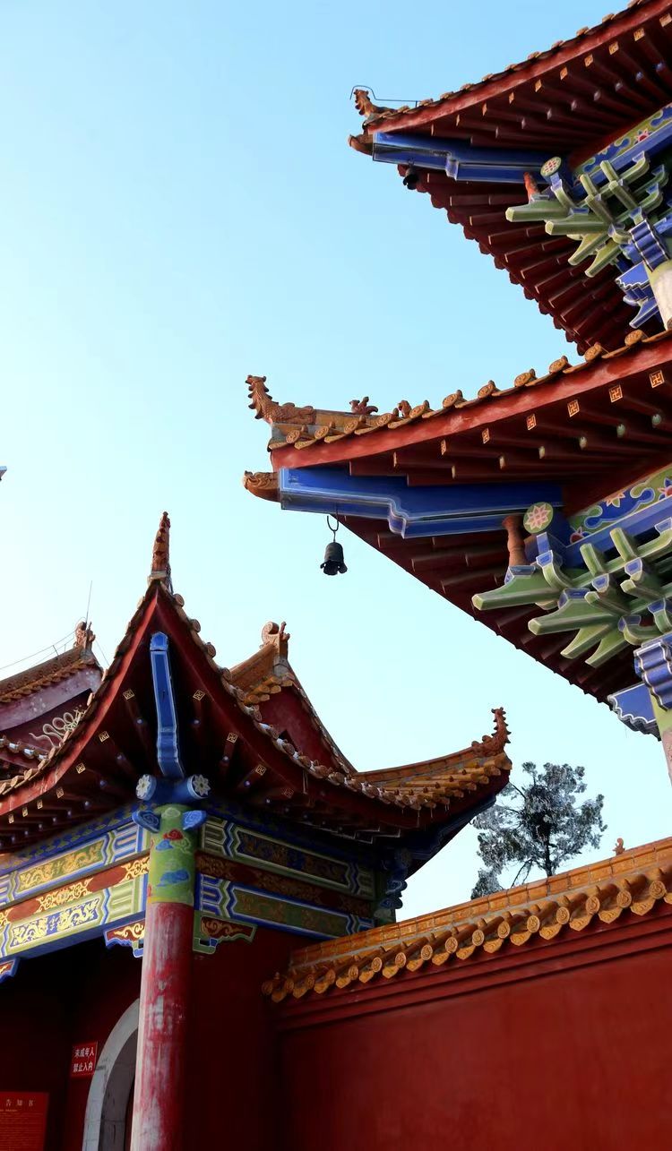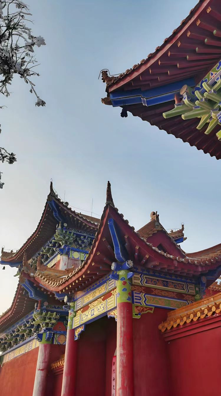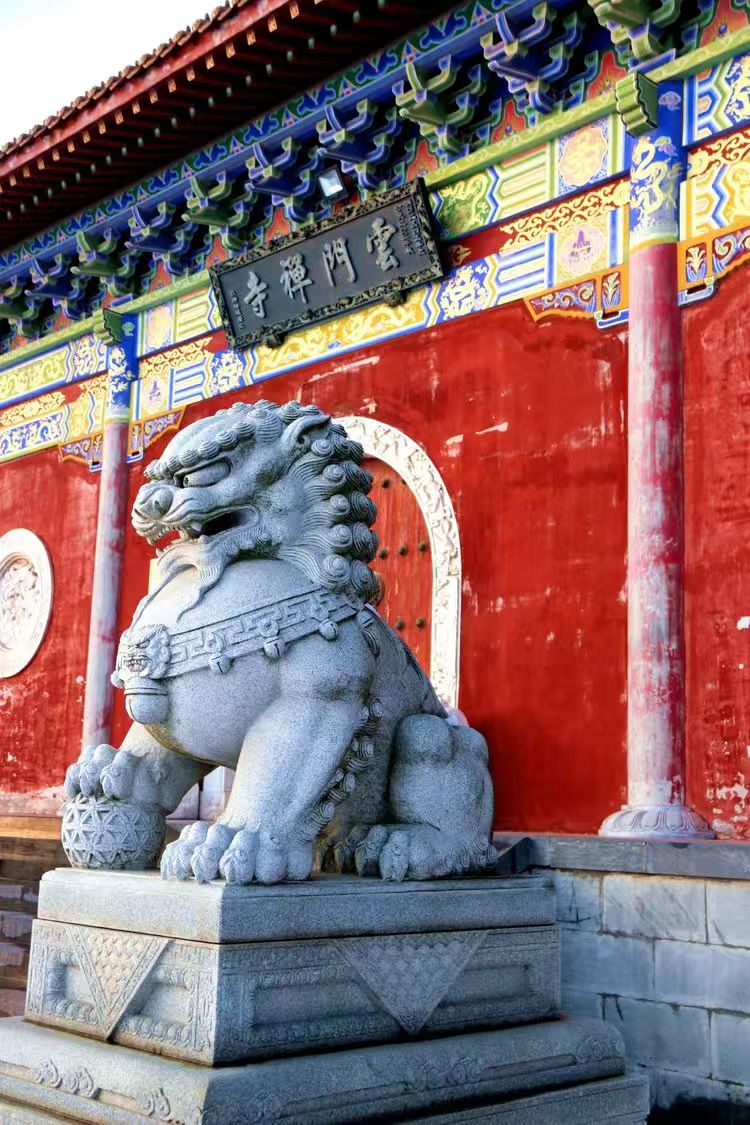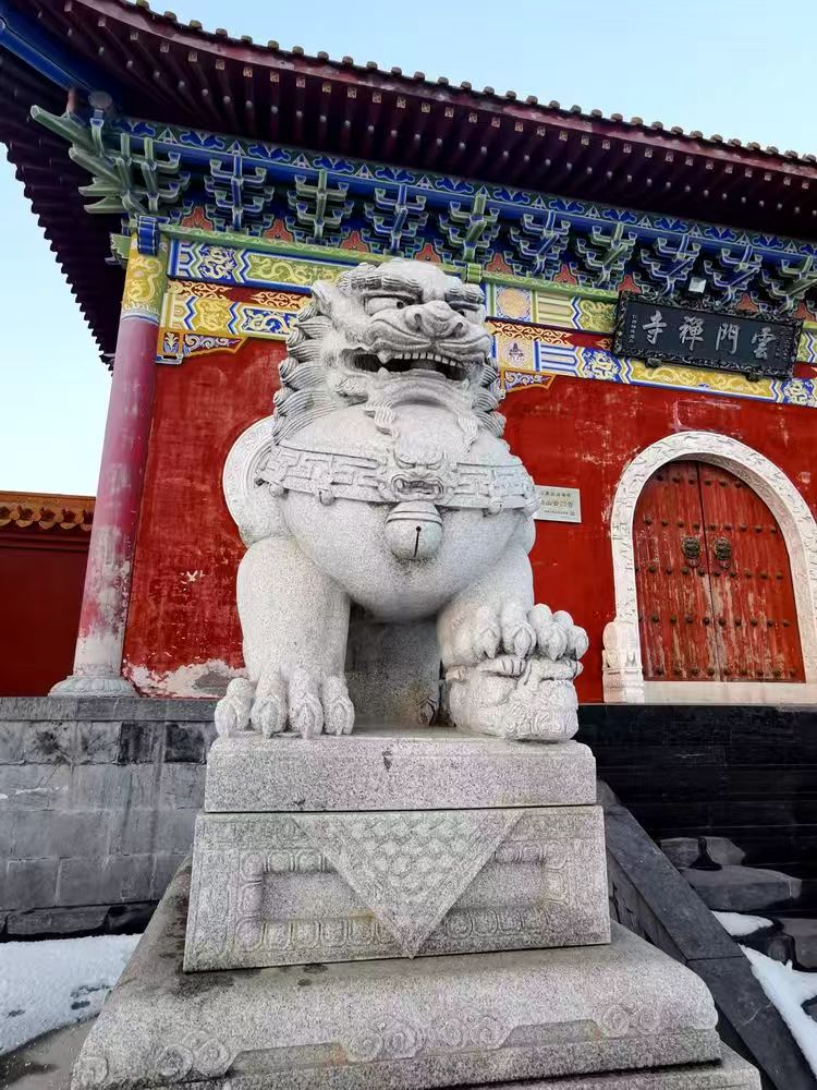 飛檐翹角攬風(fēng)雪,朱紅古墻映禪光。云門寺以斗拱彩繪勾勒古韻,以石獅鎮(zhèn)門守護(hù)安寧,每一處雕飾都是中式寺廟建筑的經(jīng)典范本。細(xì)碎的雪沫從青灰色的天幕飄下,先是輕沾在飛檐翹角上,給朱紅的廊柱描了層銀邊,再落在寺前石獅子的鬃毛間,把威嚴(yán)的神獸襯得添了幾分溫順。寺墻的紅,在白雪映襯下愈發(fā)沉艷,像陳年朱砂墨暈開在素白宣紙;斗拱上的彩繪被雪霧柔化了棱角,藍(lán)的天、綠的枝、黃的紋凝成朦朧色塊,唯有匾額上“云門禪寺”四個鎏金大字,在雪光里凝著一點暖芒,與山下茫茫雪濤相映成趣。