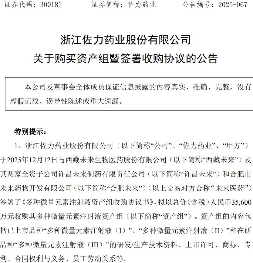其公告稱,佐力藥業(yè)擬以總價3.56億元收購西藏未來生物醫(yī)藥股份有限公司(簡稱“未來醫(yī)藥”)及其兩家全資子公司——許昌未來制藥有限責任公司和合肥市未來藥物開發(fā)有限公司持有的標的資產(chǎn)組。