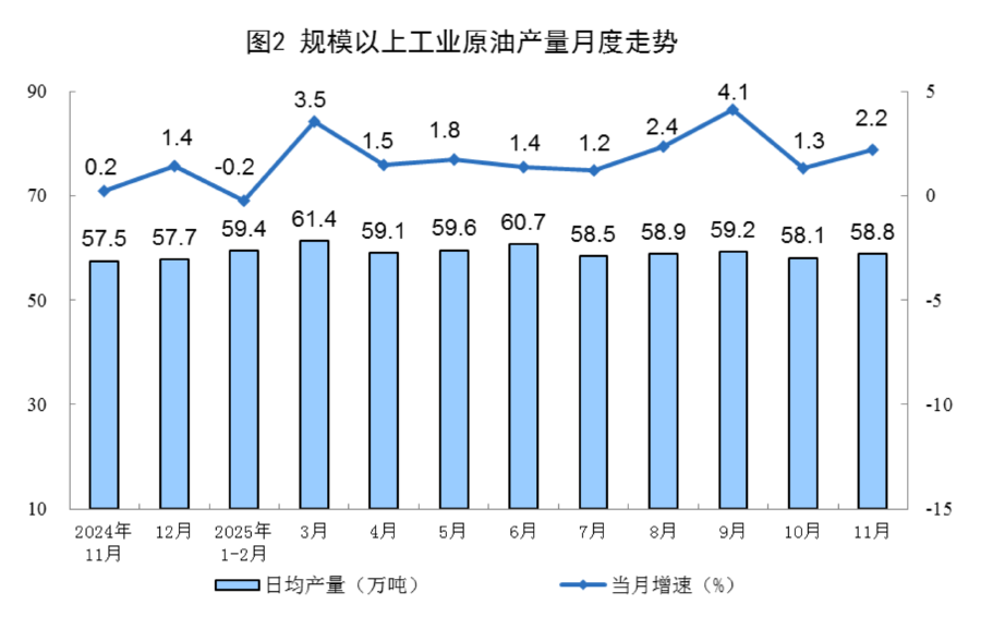 原油生產增速加快。11月份,規上工業原油產量1763萬噸,同比增長2.2%,增速比10月份加快0.9個百分點;日均產量58.8萬噸。