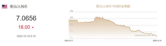 中新網(wǎng)12月15日電 據(jù)中國(guó)外匯交易中心網(wǎng)站消息,中國(guó)人民銀行授權(quán)中國(guó)外匯交易中心公布,2025年12月15日銀行間外匯市場(chǎng)人民幣匯率中間價(jià)為:1美元對(duì)人民幣7.0656元,下調(diào)18個(gè)基點(diǎn)。