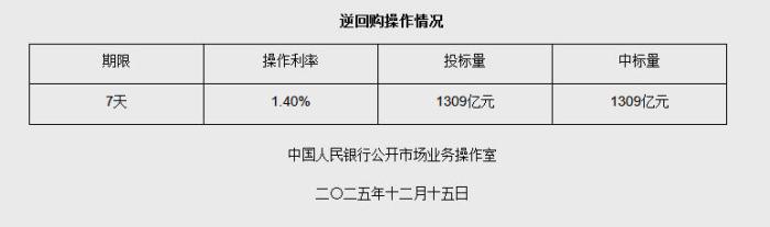 中新網12月15日電 據央行網站消息,2025年12月15日中國人民銀行以固定利率、數量招標方式開展了1309億元7天期逆回購操作。具體情況如下: