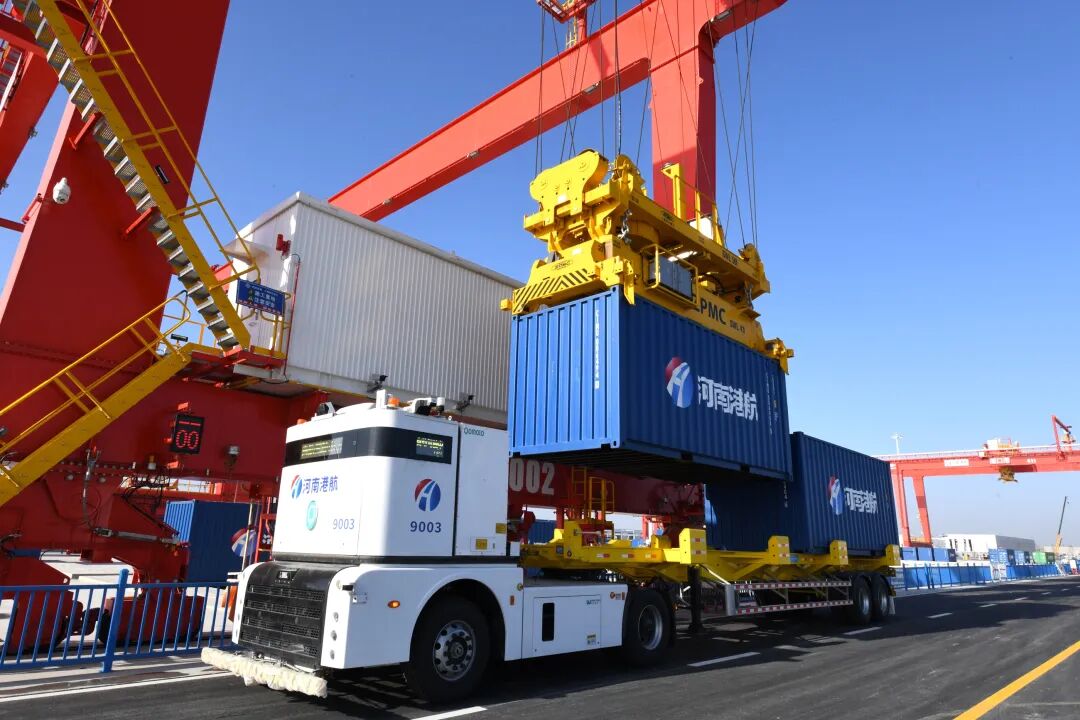 堆場自動化裝卸設備向無人駕駛運輸車裝集裝箱進行調試。