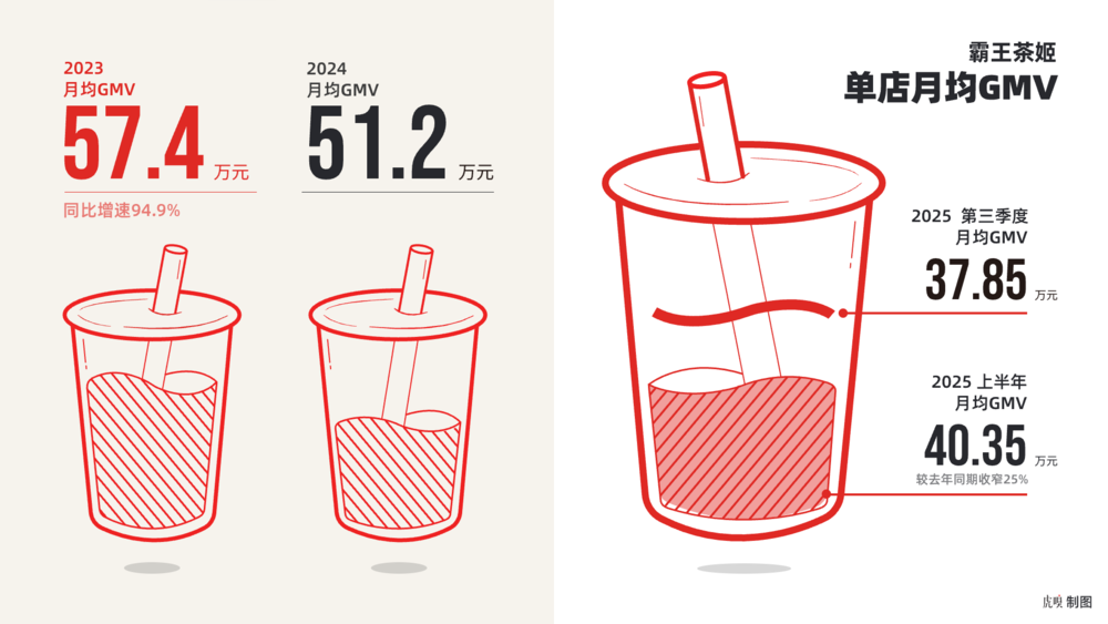 虎嗅獲悉,2023年霸王茶姬的單店月均GMV為57.4萬元,同比增速為94.9%。到2024年,霸王茶姬的單店月均GMV為51.2萬元。2025年上半年,門店單店平均GMV為40.35萬元,較去年同期的53.8萬元收窄25%。到第三季度,單店月均GMV為37.85萬元。