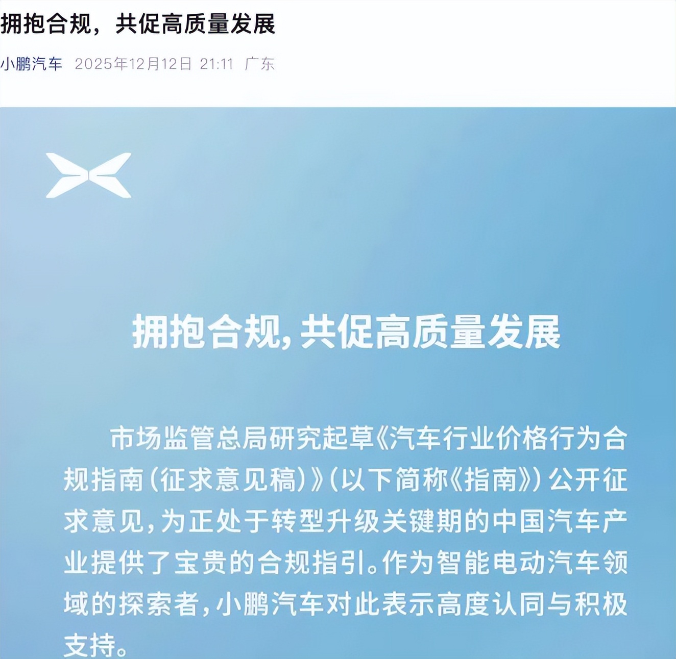 小鵬汽車在表態中特別強調“嚴格遵守明碼標價原則”,承諾全面優化定價管理體系,保障消費者的知情權與選擇權。小鵬相關負責人稱,企業長遠發展根植于對規則的尊重和對用戶的誠信,未來將聚焦技術突破與用戶體驗升級,擺脫對低價策略的依賴。