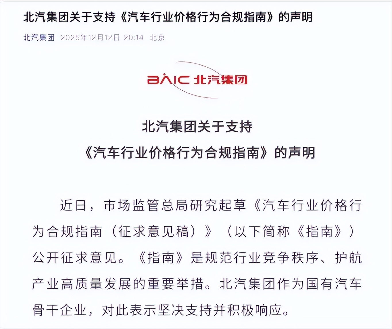 北汽集團作為國有汽車骨干企業,率先做出明確承諾,將把《指南》要求嵌入產品定價、經銷商管理、促銷推廣的全流程。其相關負責人表示,將完善價格合規管理體系,嚴守公平競爭原則,杜絕低于成本價傾銷和虛假宣傳,同時發揮產業鏈“鏈長”作用,帶動上下游伙伴共同落實合規要求,構建互利共贏的產業命運共同體。