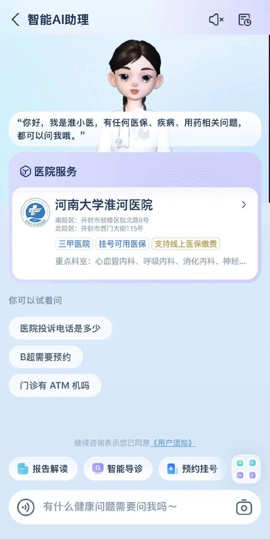 初冬,在河南大學淮河醫院門診大廳,65歲的王先生對著手機屏幕問道:“頭疼應該掛什么科?”屏幕上的卡通形象“淮小醫”立刻給出“神經內科”的建議,并同步推送了掛號鏈接。